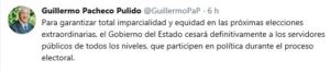 El Gobernador del Estado, Guillermo Pacheco Pulido, instruyó que ningún servidor público debe participar, en cualquiera de sus formas, en política; una vez que como autoridades se tiene la obligación de respetar el proceso electoral, a fin de garantizar la transparencia y limpieza absoluta.