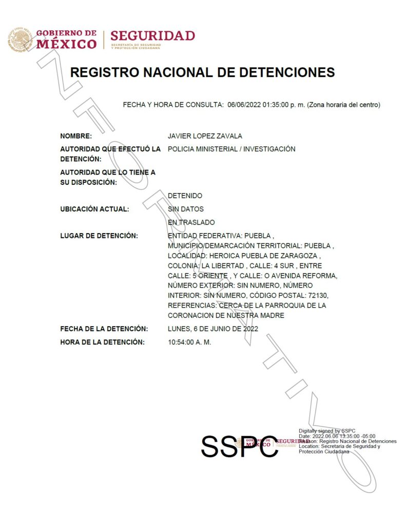 Y al parecer eso es lo que sucedió. Esta mañana fue detenido Javier López Zavala. Será que es el actor material de la ejecución de Cecilia Monzón Pérez. Estamos en espera de la confirmación por parte de las autoridades judiciales de Puebla, después de que rinda su declaración.