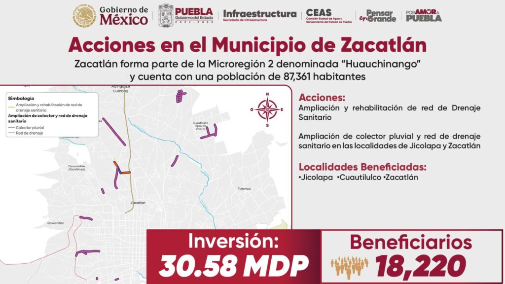 Por su parte, el secretario de Infraestructura, José Manuel Contreras de los Santos, mencionó que todos los proyectos que se ejecuten en Zacatlán contarán con soporte de servicios como la construcción del drenaje sanitario, pluvial y la red de agua potable. Aseveró que actualmente con una inversión de 23 millones de pesos, 67 por ciento recurso estatal y 33 por ciento local, la ampliación del colector pluvial y red de drenaje en la localidad de Jicolapa lleva un avance del 65 por ciento. Añadió que también se construye la Red de Drenaje Sanitario con una inversión de siete millones de pesos.