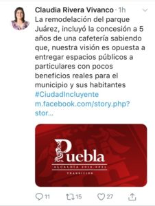 Pero hoy mediante sus redes sociales la presidenta municipal electa Claudia Rivera Vivanco, reprochó a la actual administración municipal haber otorgado la concesión a la cadena Coffee York, porque dijo “ello es contrario a nuestra visión de entregar a particulares un espacio público, que le dará pocos beneficios reales al municipio y a sus habitantes”.