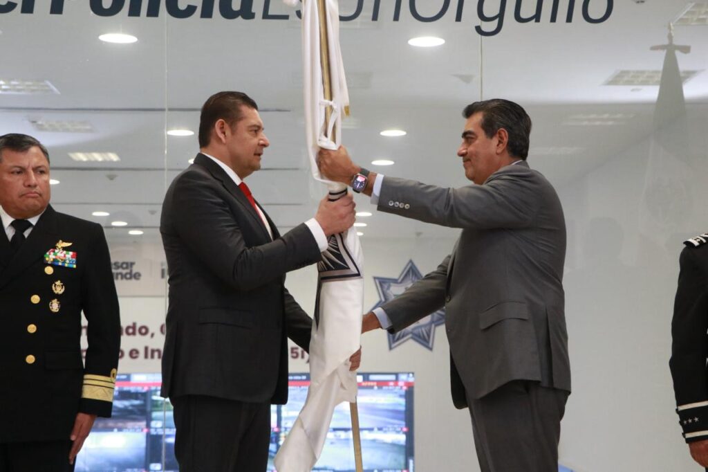 Por primera vez en Puebla, el gobernador constitucional Alejandro Armenta recibió el estandarte insignia de la SSP, de manos del gobernador saliente Sergio Salomón