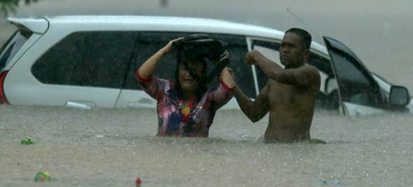 Un hombre ayuda a una mujer después de que su coche se quedara atascado en agua que le llegaba hasta la cintura. A nivel mundial, las lluvias son cada vez más extremas debido a los efectos del cambio climático.
